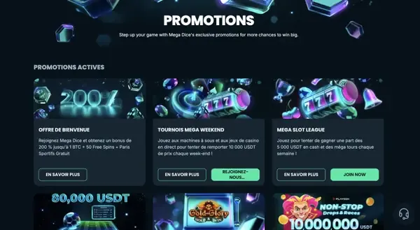 Sur MegaDice Casino, nous gardons les promotions simples : des points d’entrée clairs, des règles transparentes et des récompenses adaptées à différents styles de jeu. Vous pouvez obtenir un pack de bienvenue pour les jeux de casino, profiter d’offres régulières de cashback et participer à des tournois hebdomadaires. Nous proposons aussi un large choix de jeux : machines à sous, tables en direct, jeux instantanés, jeux crash et paris sportifs, soit environ 4 000 titres au total.